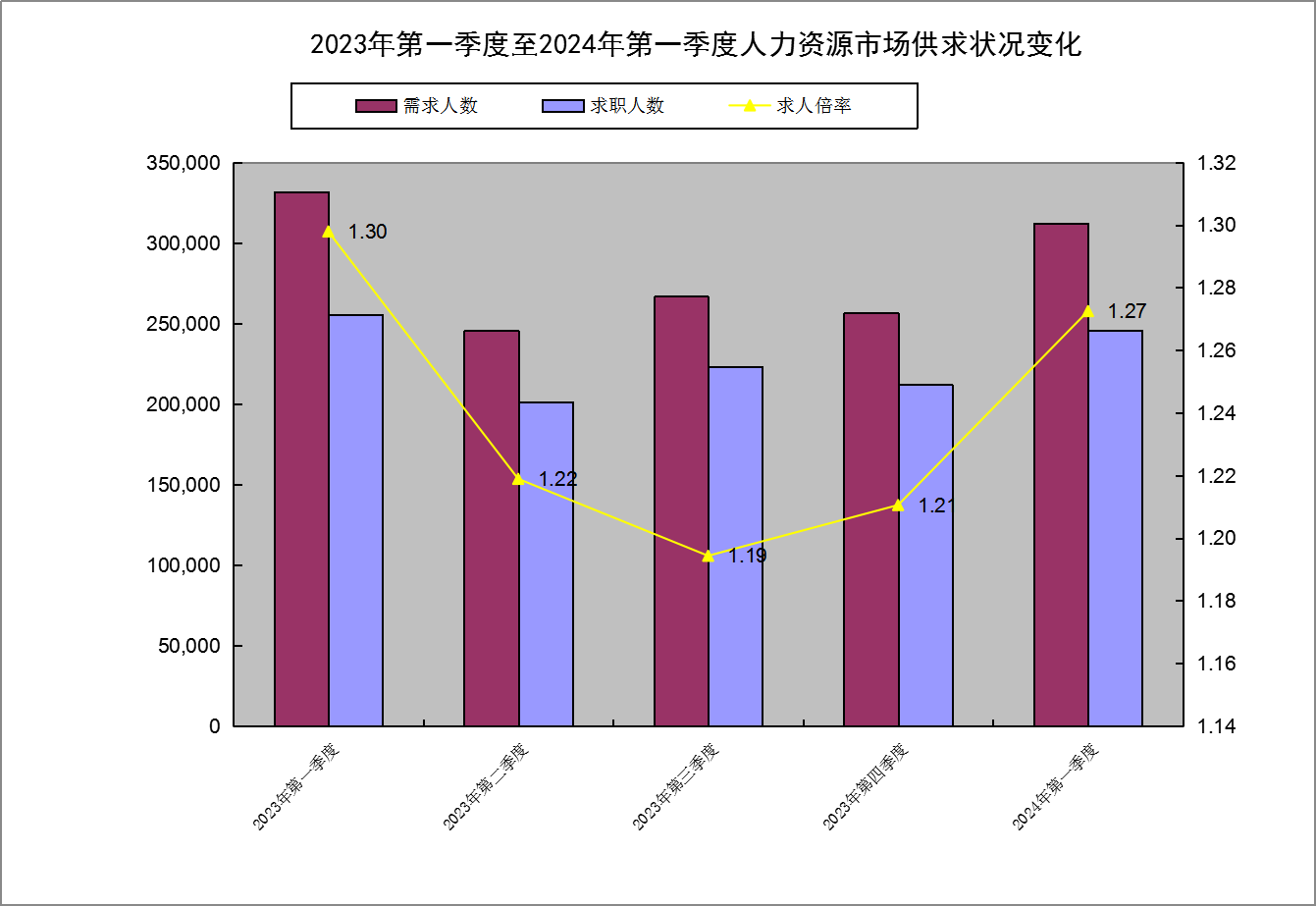 第一季度,春节前后员工离职更换工作较频繁,导致大多数企业用工需求和求职人数较上季度环比有较大幅度上升,但较上年同期,岗位需求人数、求职人数同比均下降,求人倍率同比下降,供求人数差距相比去年同期缩小,人力资源市场供求关系趋于平衡。