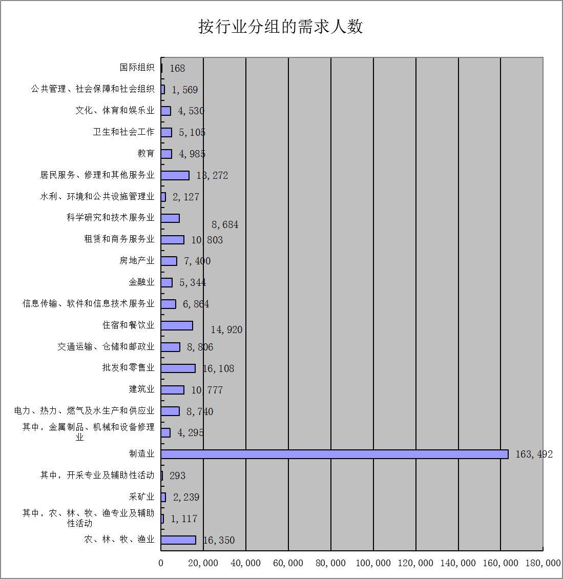 从行业需求来看:“制造业”“农、林、牧、渔业”“批发和零售业”占据着各行业中用工量的前三位。占比依次为52.35%、5.24%、5.16%。