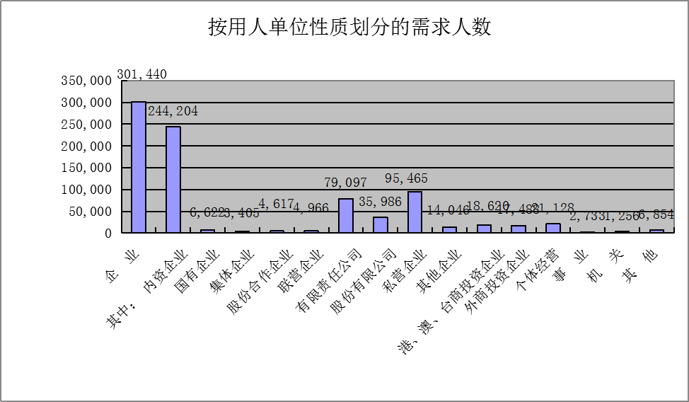 从用人单位性质来看:内资企业需求总量为24.42万人次,所占比重达到企业需求总量的81.01%;内资企业中的“私营公司”、“有限责任公司”、“股份有限公司”为用工需求量前三位的用人单位,用工需求量分别占企业需求总量的31.67%、26.24%、11.94%。