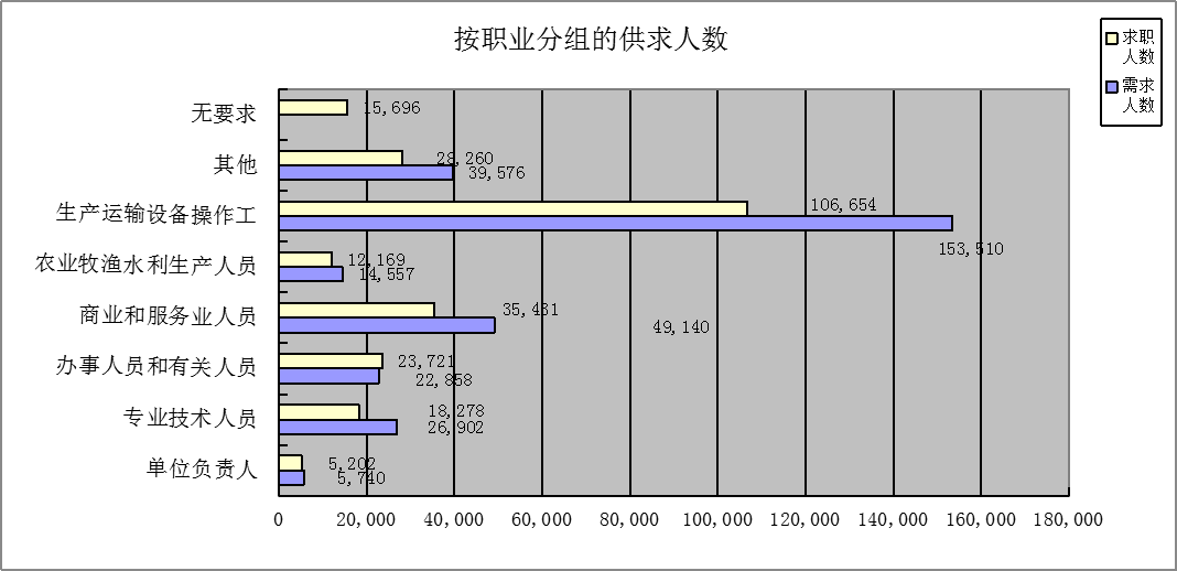 本季度我省人力资源市场有技能要求的熟练工供求总量为13.61万人次,其中岗位需求9.34万人次,求职登记4.27万人次,市场求人倍率为2.18,同比下降0.26,环比上升0.07。无技能要求的一般劳动力供求总量31.87万人次,其中岗位需求15.55万人次,求职登记16.32万人次,市场求人倍率为0.95,同比下降0.01,环比上升0.06。