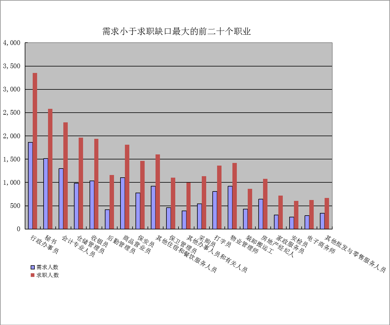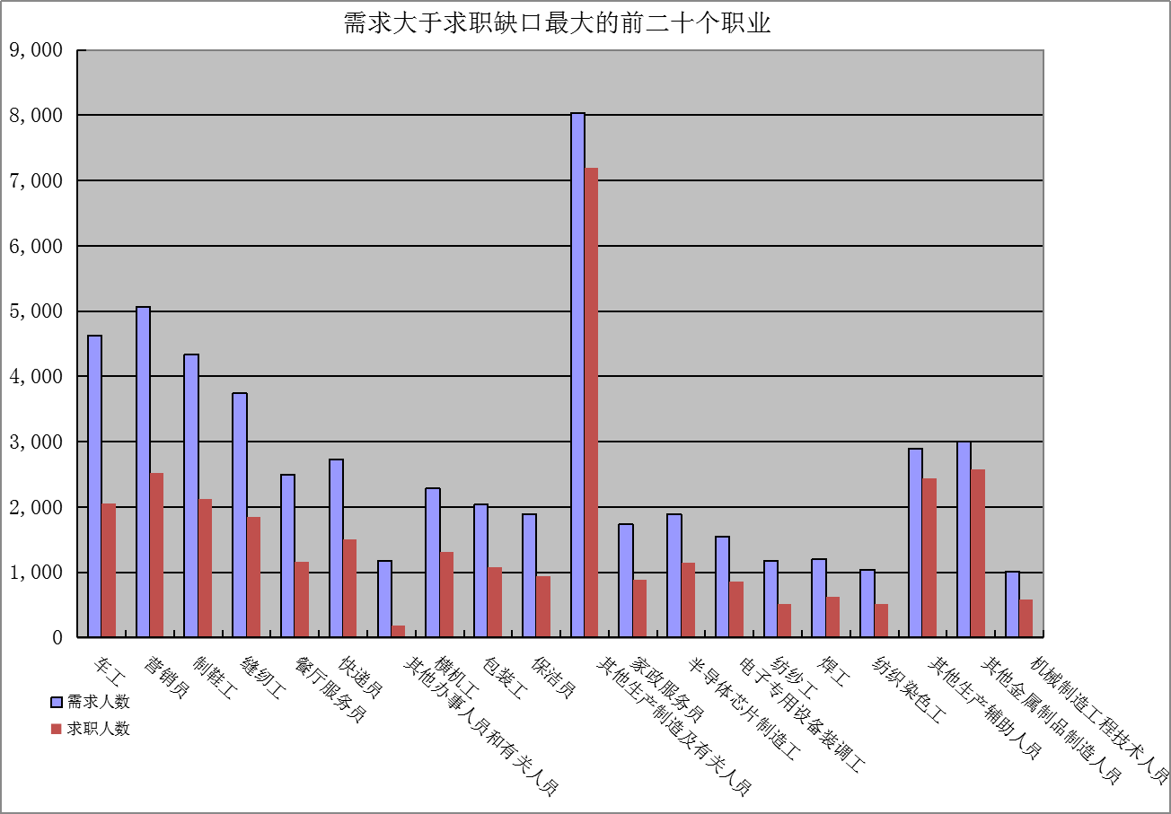 一是求大于供岗位(工种):“车工”、“营销员”、“制鞋工”企业需求缺口分别是2569人次、2546人次、2207人次。二是供大于求岗位(工种):“行政办事员”、“秘书”、“会计专业人员”的市场登记缺口分别是-1494人次、-1069人次、-997人次。