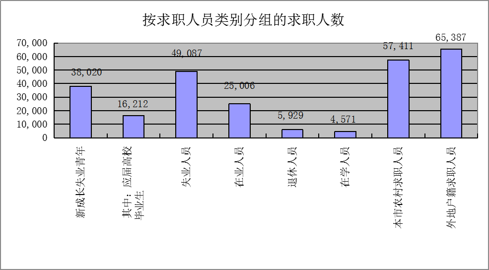 从性别上看,男、女求职人数各占总量的55.70%和43.30%,男性劳动力供给仍然高于女性,女性求职人数占求职总人数比例同比下降1.25个百分点。