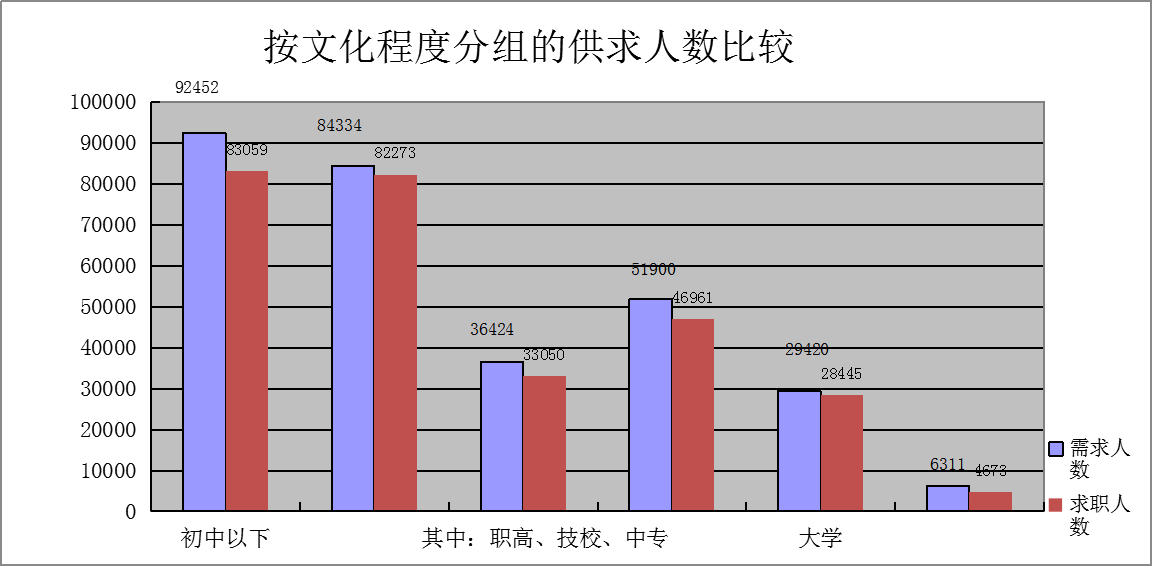 从文化程度上看,高中和初中以下学历的求职人员占求职总数的67.36%,整个人力资源供给市场学历仍相对较低,人力资源供给的素质结构需要进一步提升。