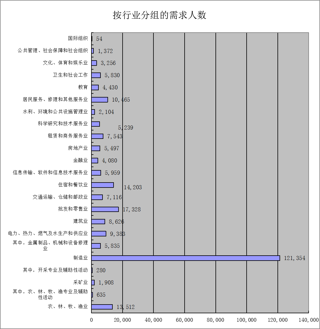 从产业需求来看:第一产业用工需求比例为5.17%,同比下降1.29个百分点,第二产业用工需求比例为54.22%,同比上升4.31个百分点,第三产业用工需求比例为40.61%,同比下降3.01个百分点。
