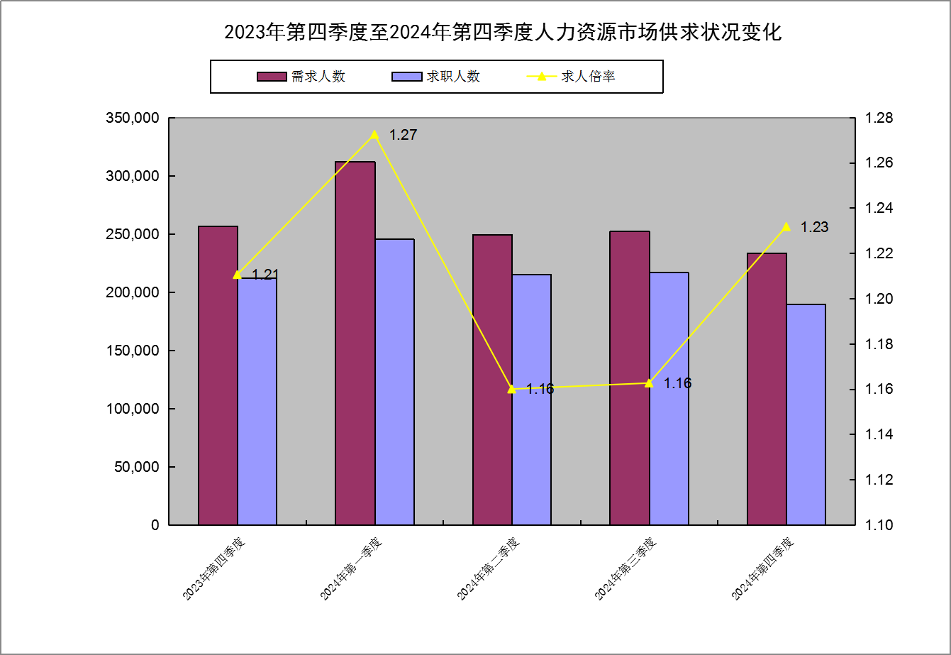 第四季度,岗位需求人数、求职人数同比均下降,供求总量较去年有所萎缩。求职人数下降较为明显,导致求人倍率环比、同比均有所上升,进一步造成企业用工缺口加大。
