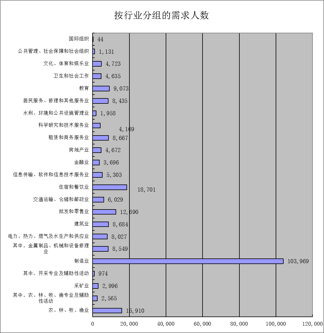 从行业需求来看:“制造业”“住宿和餐饮业”“农、林、牧、渔业”占据着各行业中用工量的前三位。占比依次为44.52%、8.01%、6.81%。