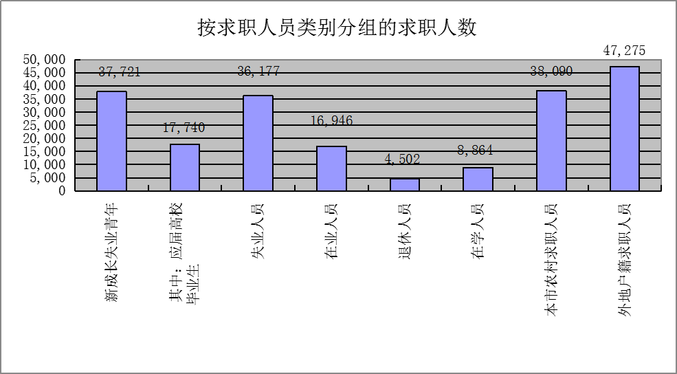 从求职人员类别上看,应届高校毕业生占求职总人数比重为9.36%,环比下降1.73个百分点,同比上升2.41个百分点,占新成长失业青年求职数的47.03%。